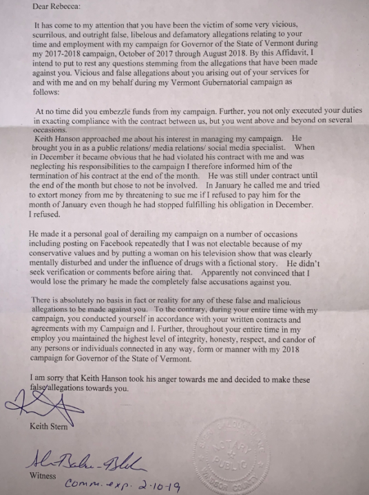 This is a letter from Gubernatorial candidate Keith Stern to Rebecca Bailey. Stern ran in a Republican primary against current VT governor Phil Scott. Both Hanson and Bailey worked for Stern with Hanson first being his campaign manager and once let go, Bailey was promoted (I think I have that ordering correct).