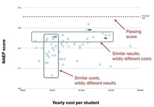 The second graph shows that there is no correlation at all between what a state spends on a student, and how well the students in that state perform: