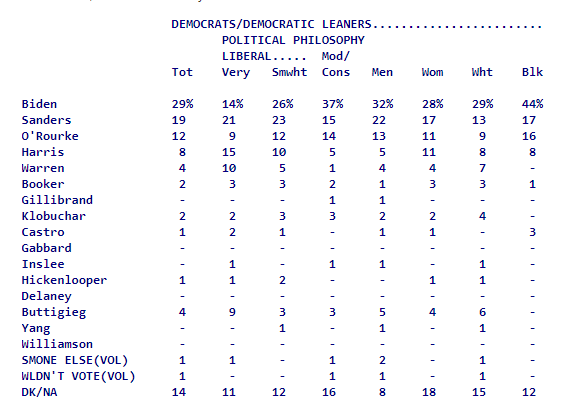 Rounding out the top five (and it is as insanely early for this as it seems) are sliding Sanders, RFO, Harris, Warren, and Buttigeig. If Harris isn’t careful (she’s the only candidate with any color in the top 5) the party of diversity will have committed “exclusive” excellence. All their favorites will be the whitest people they can find.