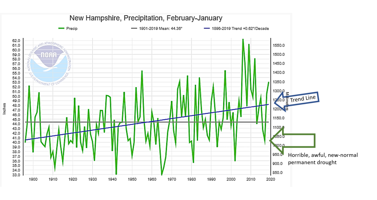 My town, for reference, has imposed odd-even day watering restrictions every summer for most of this century. It doesn’t cost anything except in perception. There’s always this ban so it must be getting drier during New Hampshire’s wettest century since records were kept.