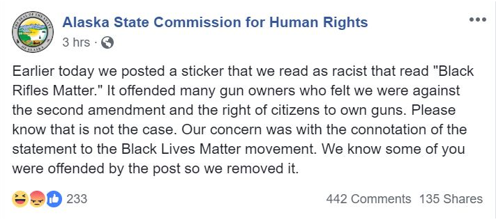 “After review of a post made on the Alaska State Commission for Human Rights social media page yesterday, my office has requested the Department of Law launch an immediate investigation into the matter,” said Dunleavy. “Protecting an individual’s constitutional rights, including the 1st amendment, is of the utmost importance to this administration.”