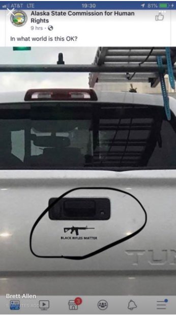 Human Right’s Commission Director Marti Buscaglia saw a “Black Rifles Matter” sticker on the back of a truck in her commission’s parking lot. It offended her so much she left her business card with a note on the back. ‘Please do not park this truck with that offensive sticker in this parking lot.’