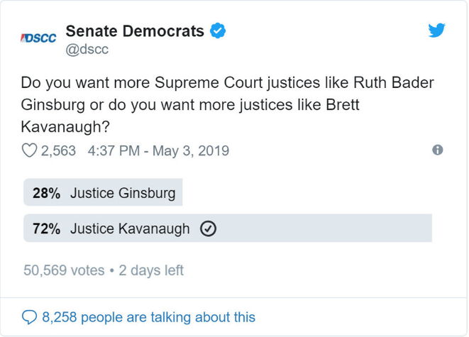 The Democrat Senatorial Campaign Committee (DSCC) thought it would be fun to do a Twitter Poll. They asked, “Do you want more Supreme Court justices like Ruth Bader Ginsburg or do you want more justices like Brett Kavanaugh?”