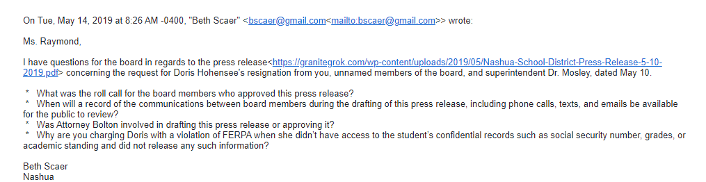 Nashua resident Beth Scaer was a good deal kinder. She sent an email to El Presidente Heather Raymond on the matter of how “the board” conducted business to arrive at this official statement?