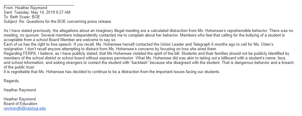 Heather Raymond, El President of the Nashua Board of Education, is convinced she’s done no wrong. A damning self-indictment that in my opinion suggests that she is no longer capable of leading that body.