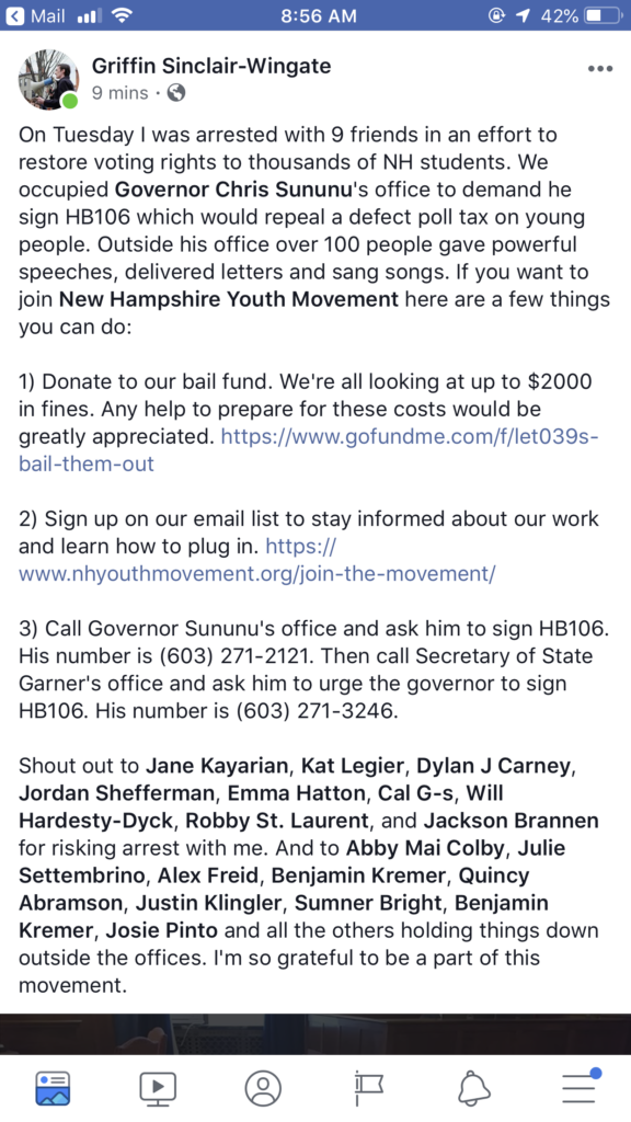 Ten were arrested on misdemeanor charges of disorderly conduct when they refused to leave the offices of Gov. Chris Sununu and Secretary of State Bill Gardner after closing time. The students were booked in the State House cafeteria and released. They’ll face fines, but no jail time.“We’re here to show Gov. Sununu and Secretary of State Gardner that we’re not going anywhere and that the student vote is important,” said Quincy Abramson, a UNH student from Concord. “They can’t drown out our voices, and in the upcoming election we will show them that.”