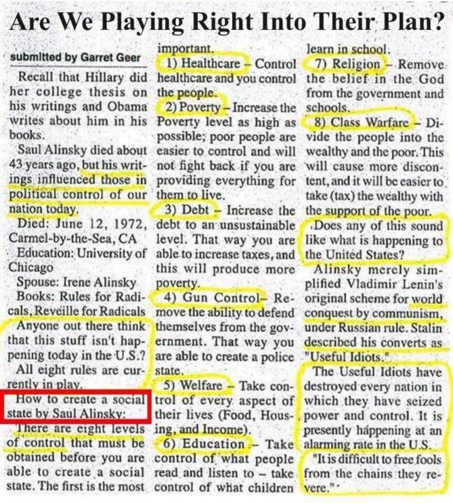 How many of you Republicans have contributed to the success of each of those Control Points in one way or another? How many of you, for instance, vote for more Control of Healthcare, for more Control of our Education system? How about another one – Control of our Energy? Each time you vote for Government to take just that next bite of control, you have just played into Saul Alinsky’s plans. A Fifth Columnist. I’m betting he’s laughing from Hell right now – look at how many of the Democrat Prez Wannabees are advocating for more and more government take over of those control points.