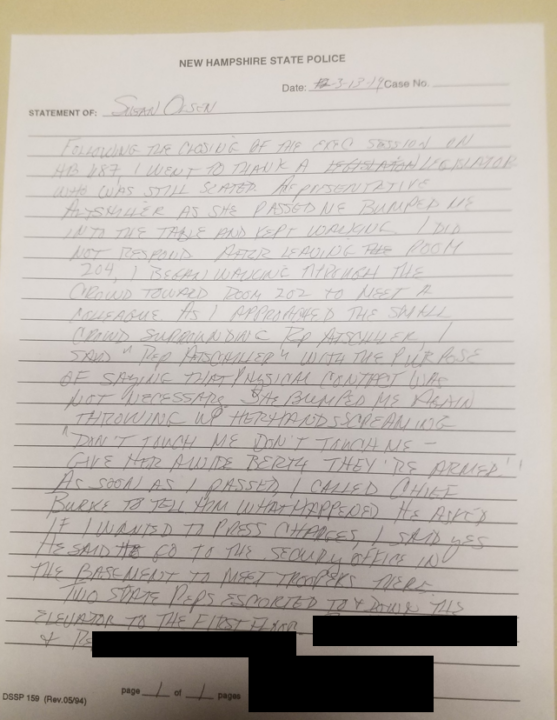 This is the second unhinged Democrat Representative who has assaulted Olsen. The first was Katherine Rogers (D-Concord), who pleaded guilty to the assault: