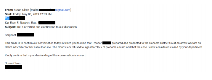 Altschiller thought she’d simply get away with assaulting Olsen by yelling some lunacy afterwards, and she has, thanks to that Concord Court clerk, but the fact remains that NH State Troopers investigated and found enough evidence to issue a warrant for Representative Debra Altschiller’s arrest.