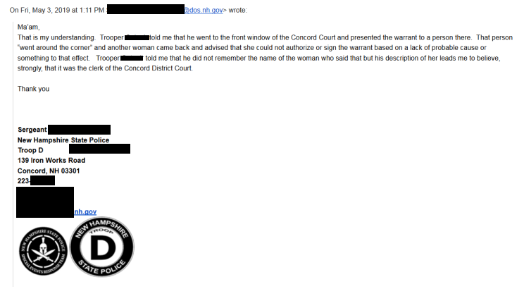The complaint was investigated by New Hampshire State Troopers, as are all complaints related to the state house. The investigating officers decided that a warrant for Altschiller’s arrest was indeed ‘warranted.’