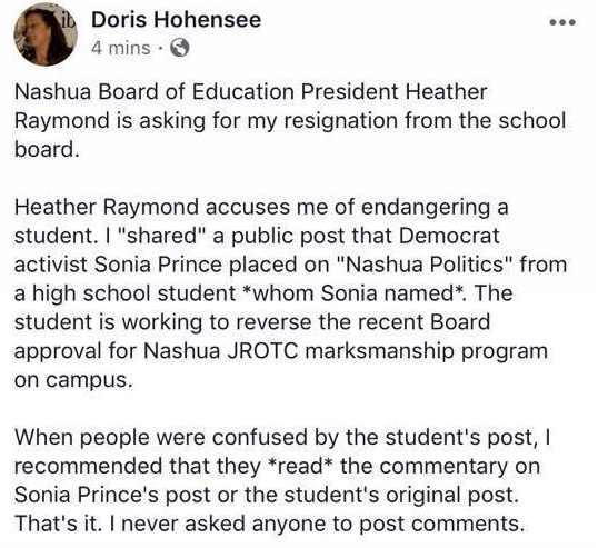 Nashua School Superintendent Jahmal Mosley and Nashua Board of Education President Heather Raymond (and even the Nashua Teachers Union) are calling for the resignation of Board of Education member Doris Hohensee. Why?
