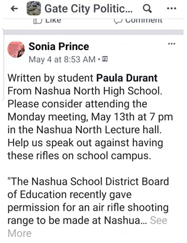 The following morning, at 8:53 am on May 4th, Sonia Prince, an Administrator at Gate City Politics, a Nashua Political Facebook Group, names the Student, and shares her post with that group and its 570+ members.