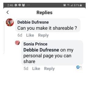 The next day at the request of another Gate City Politics group member who wants to share the students public status update (which includes their name), Sonia puts it on her own personal Facebook page and announces that it can be shared from there.