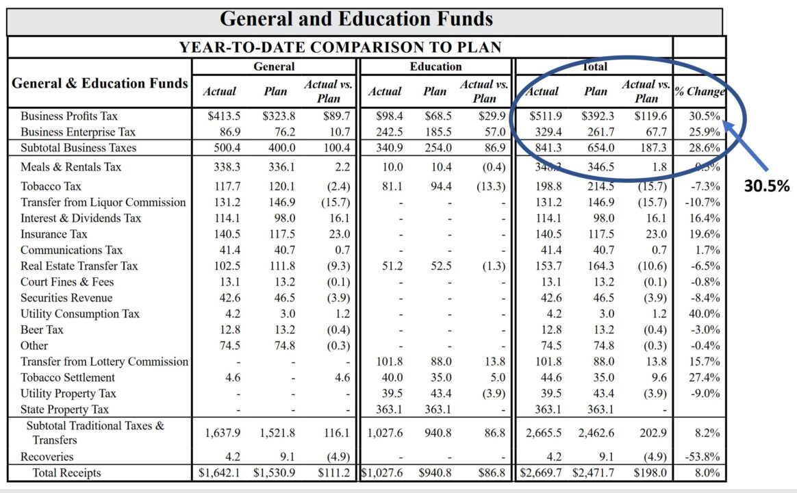 This retroactive change in state tax policy completely disrespects our business owners. It might make sense if we were experiencing a fiscal crisis due to an unforecasted decline in tax revenues. However, the reality is extremely positive with the BPT coming in over THIRTY PERCENT (30.5%) above plan (see above chart).