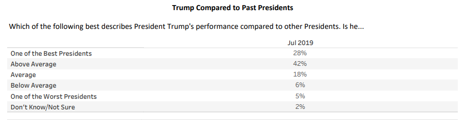 When asked to compare Donald Trump to past Presidents 70% said he was above average or one of the best Presidents. 18% said he was average, 6% below average, with 5% saying he was the worst. Only 2% didn’t express an opinion either way.