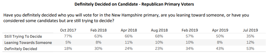 When it comes to whether Republicans have decided on a candidate to vote for in the First in the Nation Primary, 53% have decided, 12% are leaning, with 35 still not sure.
