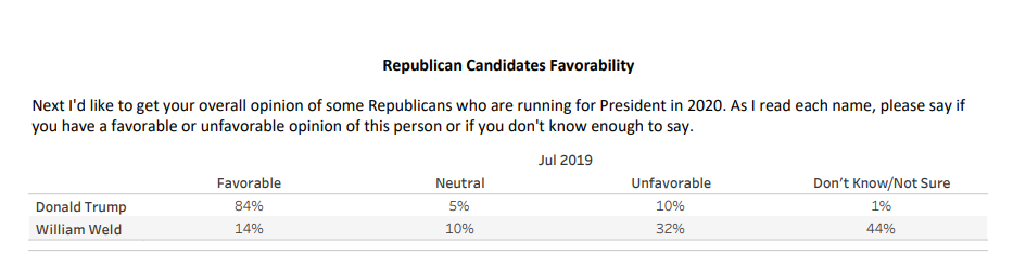 A recent UNH/CNN poll shows President Trump with an 84% favorability rating among New Hampshire Republicans. His “republican” challenger, Bill Weld, currently has a favorability rating of 14%.
