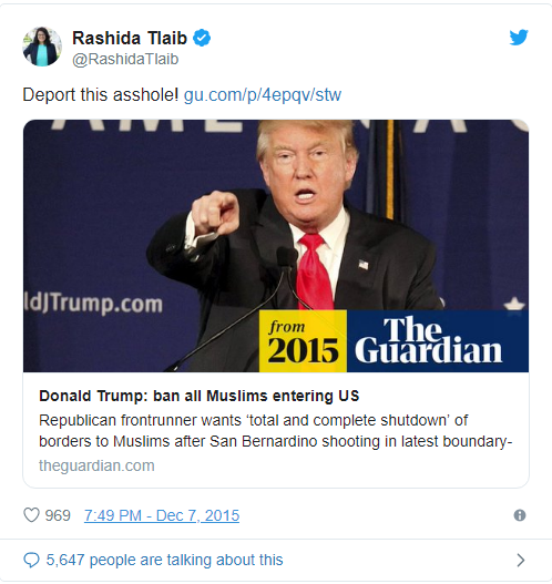 Ilhan Omar was calling for people to go back where they came from in 2012. And now we’ve got a tweet from Rashida Tlaib, suggesting that someone Deport ‘This A**hole” back in 2015.