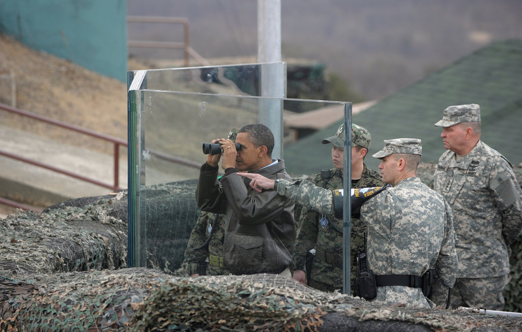 PS – This photo is a reminder of how close Barack Obama ever got to accomplishing anything in North Korea.  — A bullet-proof glass observer in a cool leather jacket.