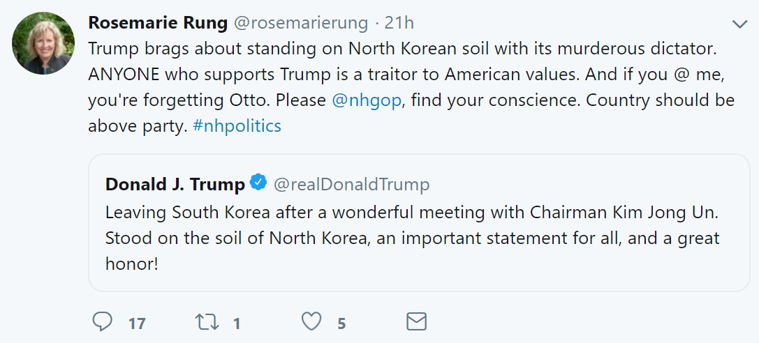 This time, she’s actually calling you a traitor to your country if you support Trump – simply because he physically went to North Korea.