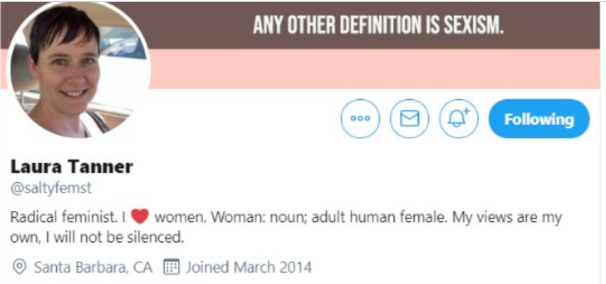 Tanner’s Twitter feed is dominated by discussion of transgender ideology’s threat to women, including young lesbians. She believes that transgender women – biological males – are wrongly appropriating a female identity.