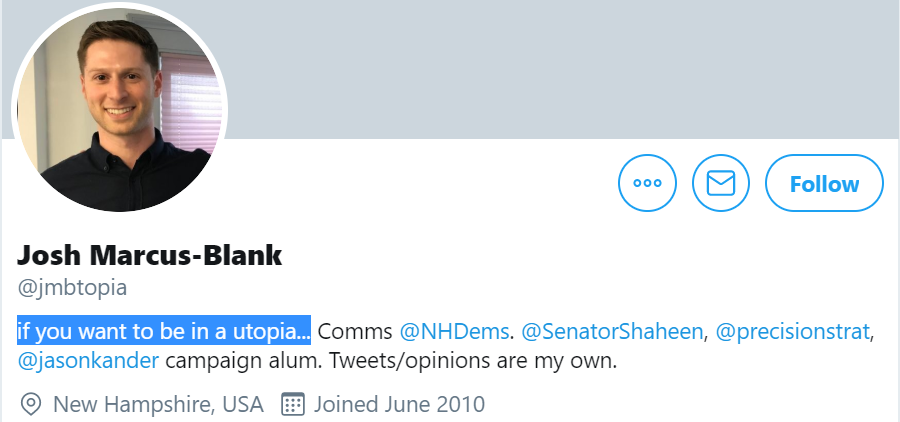 And so, Josh Marcus-Blank is now in Kirstein’s former abode at the NH Democrat party. I’ve already had one run-in with Mr. Josh – at the NH GOP Spring to Victory party where he had 5 souls trying to get any kind of attention from the attendees for his simpleton “protest” against Gov Sununu’s inauguration finances. At the time, I wrote this: