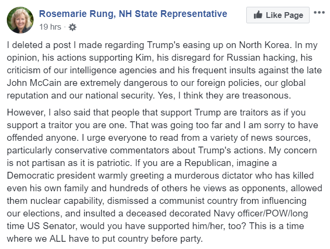 Yesterday, Merrimack State Rep Rosemarie Rung (contact info) called Trump supporters traitors (here) because the President visited North Korea.