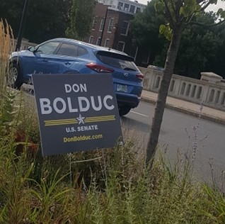 As noted, other people had campaign signs. Senate candidate Don Bolduc had them on the road (everywhere) heading up to the Arena. Still there when I was sitting in traffic at 10 pm waiting to go home and even the day after. And, still there today. >>>