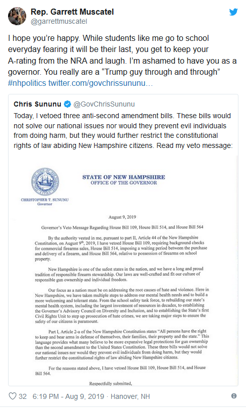 Representative Garrett Muscatel (D-Grafton), seemed to be really upset that Sununu vetoed Bloomberg’s gun control, so much so that he chose to LIE about it on Twitter: