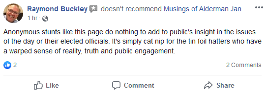 By leaving LOTS of “not recommended” comments, they are trying to shut down the “Musings of Alderman Jan” page by showing FB a large number of downchecks – led by no other than “Hitler should have bombed it” and “F*** you hard” Ray Buckley who has no shame and it is obvious that no one in his Party was willing to hold him accountable for HIS own words.