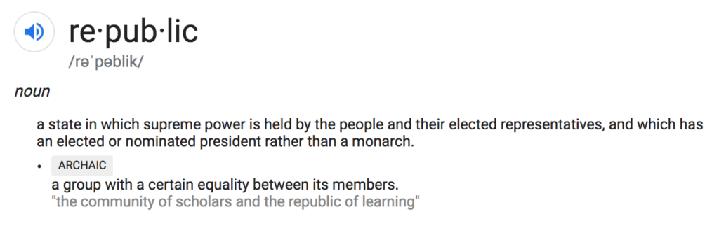 Oxford Dictionary defines a Republic as “a state in which supreme power is held by the people and their elected representatives, and which has an elected or nominated president rather than a monarch.”