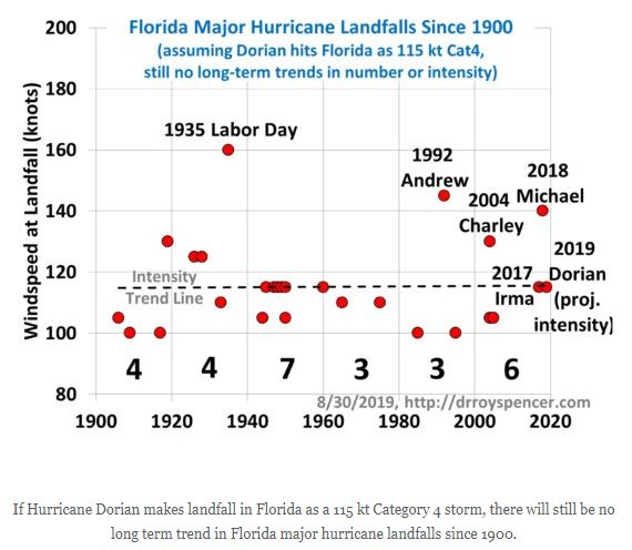 If we examine the record of major (Category 3 or greater) hurricanes at landfall in Florida since 1900, and assume that Hurricane Dorian strikes Florida as a 115 kt Category 4 storm, we see that there will still be no long-term trends in either the intensity or number of major landfalling hurricanes.