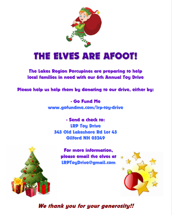 The Lakes Region Porcupines is a group of around 30-75 people that meet monthly for Chinese food and fellowship. Many are part of the Free State Project while a number of us are just Liberty and Freedom minded (and I don’t go often enough!). They also are community minded with regular “pick up highway trash” days, helping people in need around Thanksgiving, and as they have for a few years now, helping out with toys for the young’uns.