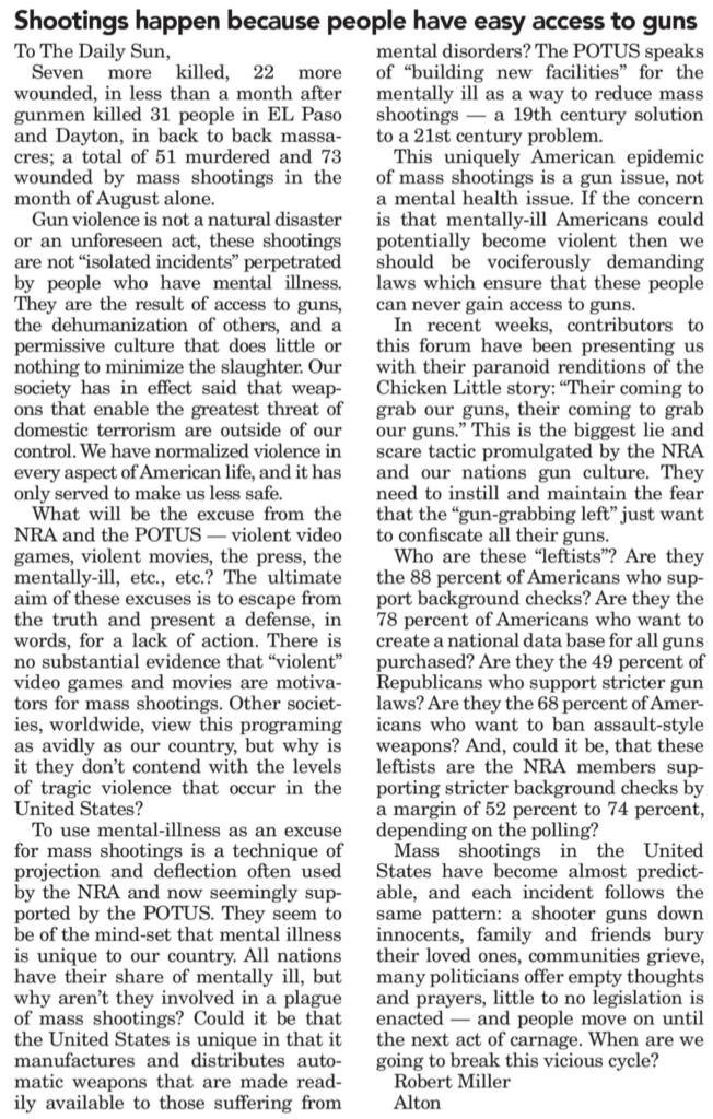 Robert Miller believes that mass shootings are uniquely American. Please research Norway, Australia, Kenya (2013 & 2015), and France. And, if you’ll allow arson as a valid form of mass murder, check out Kyoto and our own NYC. Vehicles? France and Germany.