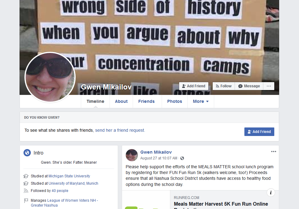 Gwen Mikailov, who is the Manager for the Greater Nashua League of Women Voters, according to her Facebook page, decided to get involved in the left-wing outrage but she took it a dangerous step further. From her Facebook page: