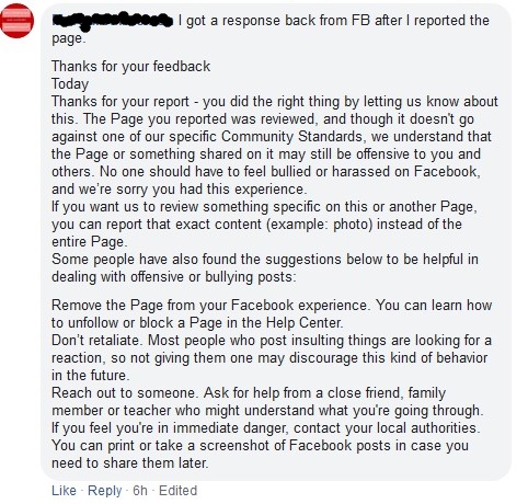 By they way: The Facebook page they are all so unhinged over? Even Facebook agrees it isn’t harassment or bullying: