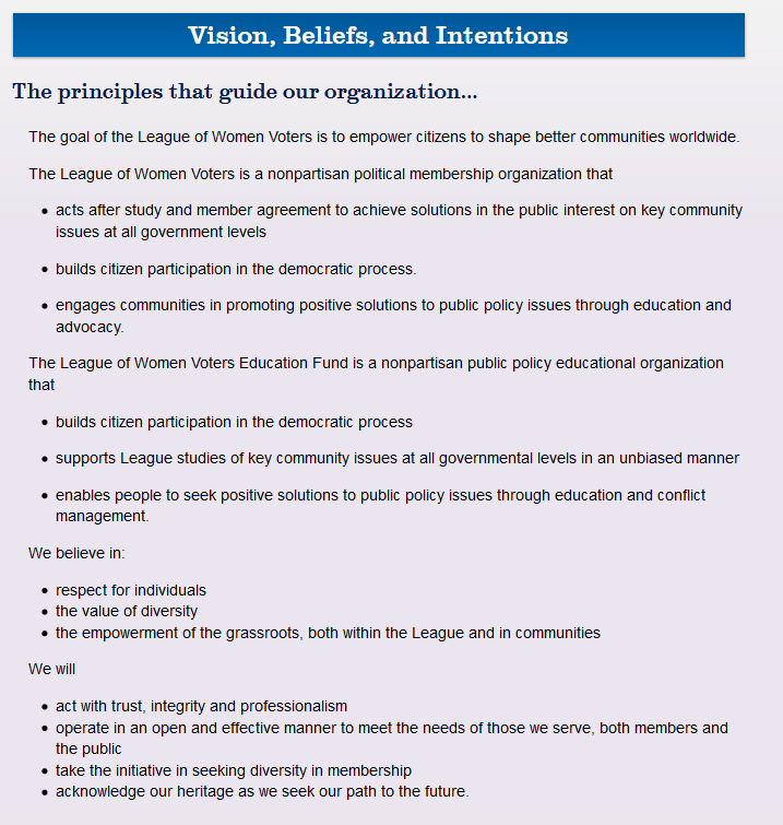 When I looked over at the League of Women Voters site, I found this interesting statement from them about their ‘vision, beliefs and intentions’: