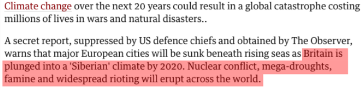 In 2004 the Pentagon, or someone in it, issued a secret report. In this document, they claimed catastrophic global chaos if we didn’t spend gazillions to mitigate this or that climate whatever.