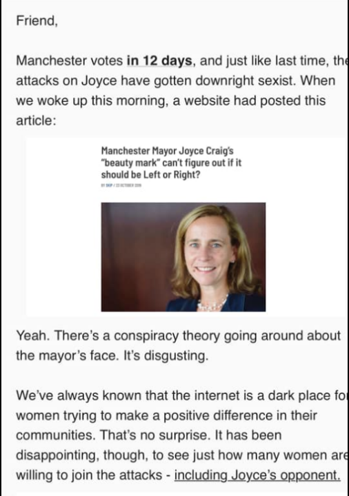 This really is hilarious – and I bet that the Mayor Craig campaign decided to make the bet that no one actually WATCHED either video (or WMUR running it). Well, leave it to them to try to fund raise off something THEY created – and trying to throw the woman card to make it “plausible”. See below: