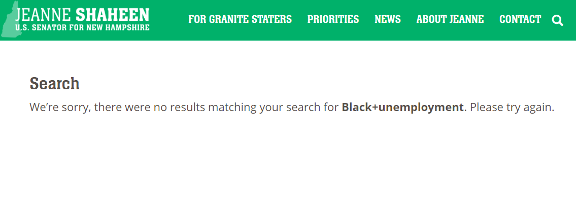 First, I’ll use senior NH Democrat US Senator Jeanne Shaheen as an example. There is no news remotely recent on her Senate page about black unemployment, record low black unemployment, record low unemployment, or anything related to black employment.