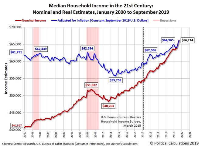 The following chart shows the nominal (red) and inflation-adjusted (blue) trends for median household income in the United States from January 2000 through June 2019. The inflation-adjusted figures are presented in terms of constant September 2019 U.S. dollars.