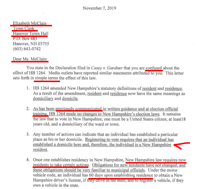 The clerk in Hanover is a prominent member of the League of Women Voters Vote Stealers and party to the lawsuit to overturn the law they claim is confusing. After multiple media reports, NH Secretary of State Bill Gardner wrote to the Hanover clerk to try and straighten the matter out.