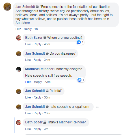 Nashua Democrat Jan Schmidt is the co-sponsor of a proposed bill that would define (presumably) a point where interacting with a public official online becomes cyberstalking or bullying. Jan is no friend of free speech, but she thinks she is and to make the case she borrows someone else’s.