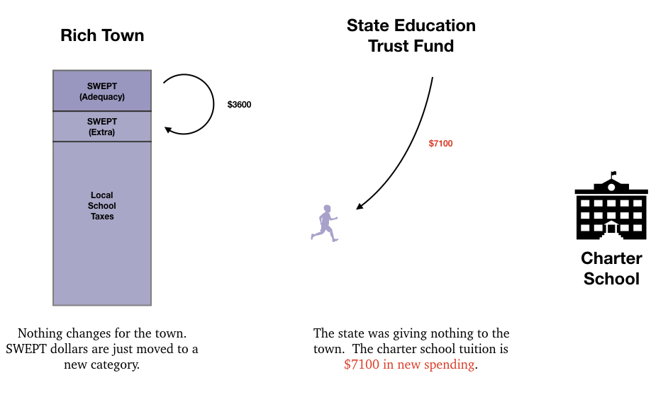 If there’s a SWEPT deficit, the $3600 that the state would normally give to the district for that student is given instead to the charter school. Since the district budget is not reduced by the loss of the student, it has to recover that money from residents. The state has to come up with an additional $3500 in new spending from the state education trust fund to pay tuition to the charter school.