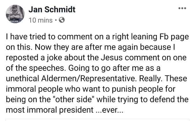 The gift that keeps on giving has given more. I know, how does Representative Jan Schmidt do it? She has taken to Facebook, opened her precious yap, and is now dumbfounded by the response to her sharing “a joke” about crucifying another human being.
