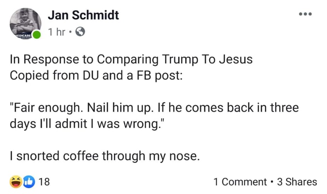 Speaking of God, Jan happily shared some crucifixion “humor” on Facebook that made her laugh. She even wrote, ‘I snorted coffee through my nose.’