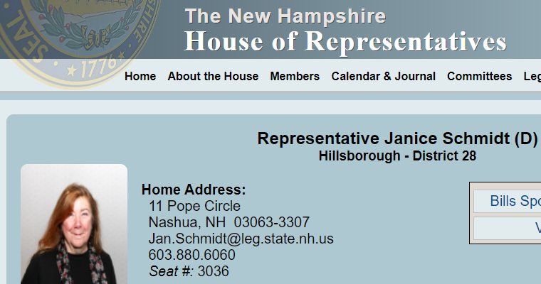 Yep, NH State Rep Jan Schmidt.  Yep, the image is from the State of NH website for the NH House, specifically the Roster information for each and every House member.  ALL the information one would need to complete the information that would be the core part of a Doxxing. Proved, free of charge and in 30 seconds – by the Speaker of the House “Deputy Dawg” Shurtleff.  Hey, he’s in your Party, right Jan?  Your own leadership – doing it to you.  Whether you take a screenshot or just link to the page.