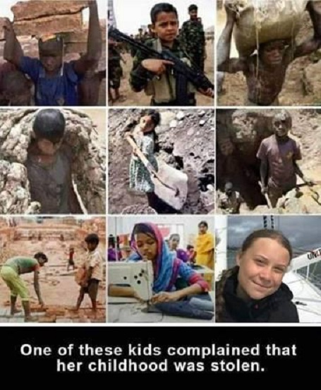 This is the problem with the First World – problems we think are existential pale with those in the developing or Third World countries. Greta thinks her life is ruined? What about those other children shown in that collage below. Would Greta be willing to swap places with them? Very doubtful, in my opinion. Those are REAL examples of having childhoods stolen from children: hard work, long hours, barely getting by – even being child soldiers. She thinks she and her Friday-school-truants have life tough? Or those kids that have traveled to Madrid to “show off” their advocacy? Sorry kids, you’re just the side show when adults get together with anticipation of divvying up trillions of other peoples’ monies.