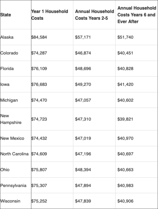 We conclude that among the 11 states analyzed, the GND would cost a typical household a minimum of $74,287 in the first year of implementation. Among 10 of the states, excluding Alaska at $84,584, the average household burden of the GND in its first year is $75,168. For the subsequent four years, the average annual costs per household for 10 of the 11 states is $47,755, decreasing to $40,706 for ever after.