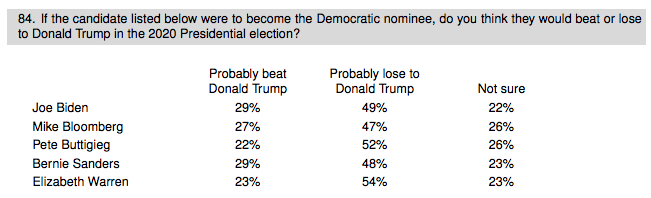 By a 52% to 48% margin, Trump is leading the generic “Democrat” in the race when voters were asked “Who do you think will win,” a significant margin for a president who just beat back impeachment to stay in office. The latest Economist/YouGov survey also found that most voters believe that Trump will probably beat all of his Democratic challengers by at least 19 percentage points.